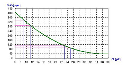 在圖中, CL=24 pF 時(shí)的頻率敏感度是10 ppm/pF, 及CL=10 pF時(shí)的頻率敏感度是20 ppm/pF. 在并聯(lián)線路中, 負(fù)載電容越小, 頻率對負(fù)載電容變化的敏感度越高. 相反的, 負(fù)載電容越大, 頻率對負(fù)載電容變化的敏感度越低. 這就是石英晶體共振子用于VCXO線路上時(shí), 線路設(shè)計(jì)上會選用較小負(fù)載電容. 反之, 在要求較準(zhǔn)確的頻率信號時(shí), 線路設(shè)計(jì)上會選用較高的負(fù)載電容.