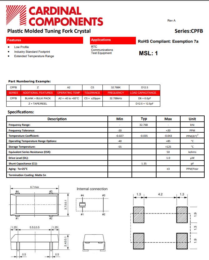 | CPFBZ-A2C4-32.768KD6 | Cardinal晶振 | CPFB | 32.768kHz | 6pf | 10ppm | 50 kOhm | -40°C ~ 85°C |