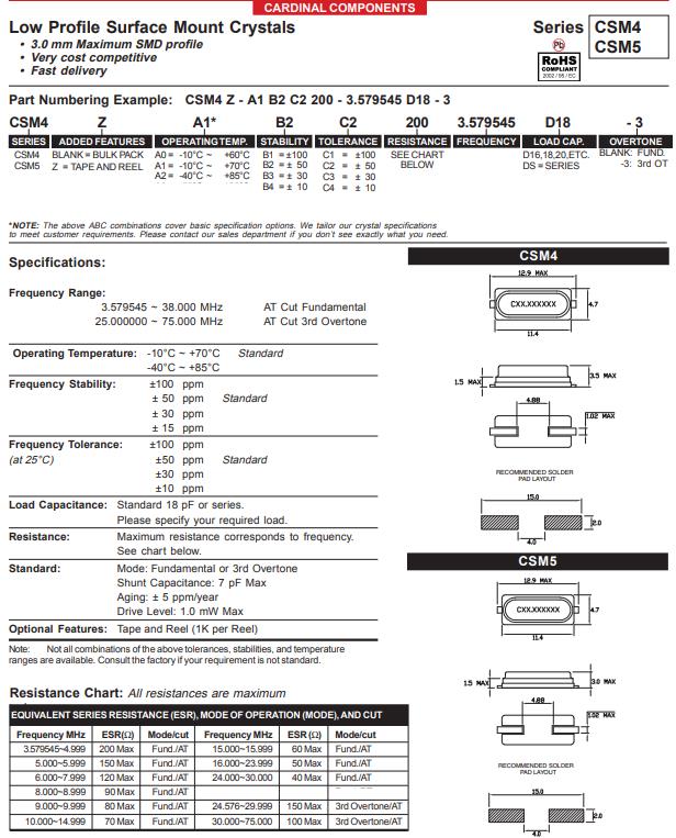 卡迪納爾晶振,CSM4Z-A2B3C3-40-12.0D18,6G低成本晶振參數(shù)表
