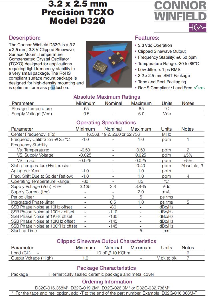 D32G-016.368M|6G模塊晶振|3225mm溫補(bǔ)晶振,ConnorWinfield晶振,D32G有源晶振,D32G-016.368M晶振,3225mm晶振,石英貼片晶振,溫度補(bǔ)償晶體振蕩器,頻率16.368MHz,電壓3.3V,工作溫度-30~85°C,頻率穩(wěn)定性0.5ppm,低抖動(dòng)晶振,無鉛環(huán)保晶振,6G模塊晶振,北斗導(dǎo)航晶振,通信模塊晶振,儀器設(shè)備應(yīng)用晶振.