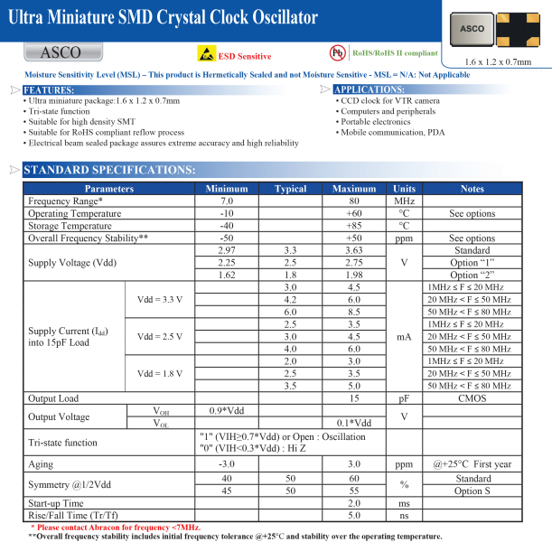 ABRACON晶振,ASCO-12.000MHZ-EK-T3晶振,ASCO晶振,有源晶體振蕩器.有源晶振,是只晶體本身起振需要外部電壓供應(yīng),起振后可直接驅(qū)動CMOS 集成電路,產(chǎn)品本身已實(shí)現(xiàn)與薄型IC(TSSOP封裝,TVSOP封裝)同樣的1mm厚度,斷開時的消費(fèi)電流是15 µA以下,編帶包裝方式可對應(yīng)自動搭載及IR回流焊接(無鉛對應(yīng))產(chǎn)品有幾種電壓供選1.8V,2.5V,3V3.3V,5V,以應(yīng)對不同IC產(chǎn)品需要.