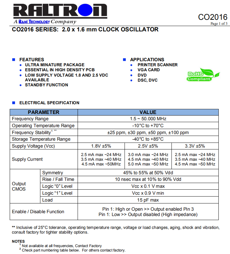 Raltron晶振,CO2016晶振,石英晶體振蕩器.有源晶振只是晶體本身起振需要外部電壓供應,起振后可直接驅動CMOS集成電路,產品本身已實現與薄型IC(TSSOP封裝,TVSOP封裝)同樣的1mm厚度,斷開時的消費電流是15µA以下,編帶包裝方式可對應自動搭載及IR回流焊接(無鉛對應)產品有幾種電壓供選1.8V,2.5V,3V3.3V,5V,以應對不同IC產品需要.
