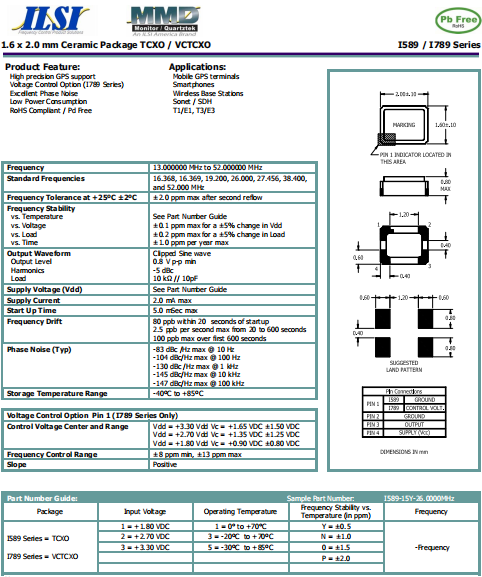 ILSI晶振,I789晶振,壓控溫補(bǔ)晶體振蕩器.智能手機(jī)晶振,產(chǎn)品具有高精度超小型的表面貼片型石英晶體振蕩器,最適用于移動(dòng)通信終端的基準(zhǔn)時(shí)鐘等移動(dòng)通信領(lǐng)域.比如智能手機(jī),無(wú)線通信,衛(wèi)星導(dǎo)航,平臺(tái)基站等較高端的數(shù)碼產(chǎn)品,晶振本身小型,薄型具備各類移動(dòng)通信的基準(zhǔn)時(shí)鐘源用頻率,貼片晶振具有優(yōu)良的電氣特性,耐環(huán)境性能適用于移動(dòng)通信領(lǐng)域,滿足無(wú)鉛焊接的高溫回流溫度曲線要求.