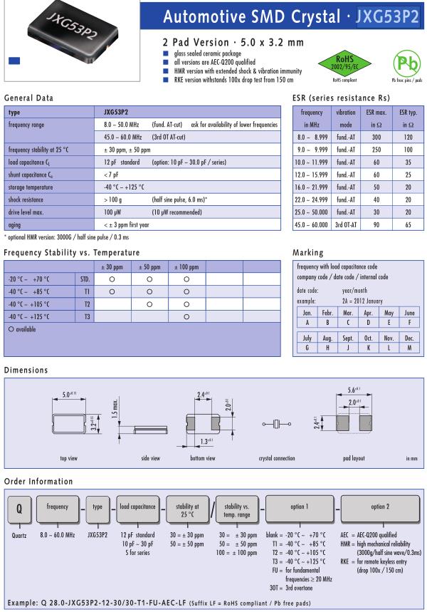 JAUCH晶振,JXG53P2晶振,石英晶體諧振器.5032mm體積貼片晶振適用于汽車電子領域的表面貼片型石英晶振,本產品已被確定的高信賴性最適合用于汽車電子部件,晶體在極端嚴酷的環境條件下也能發揮穩定的起振特性,晶振本身具有耐熱,耐振,耐沖擊等優良的耐環境特性,滿足無鉛焊接的高溫回流溫度曲線要求,符合AEC-Q200標準.