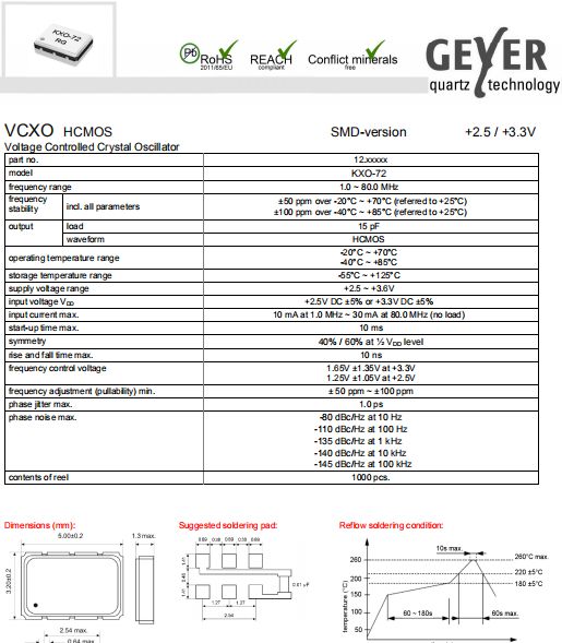 Geyer晶振,KXO-72晶振,環(huán)保振蕩器.VCXO晶振具有最適合于移動通信設備用途的高穩(wěn)定的頻率溫度特性.為對應低電源電壓的產(chǎn)品.(可對應DC +1.8 V±0.1 V to +3.2 V±0.1 V )高度:最高1.0 mm,體積:0.007 cm3,重量:0.024g,超小型,輕型.低消耗電流,表面貼片型產(chǎn)品.(可對應回流焊) 無鉛產(chǎn)品.滿足無鉛焊接的回流溫度曲線要求.