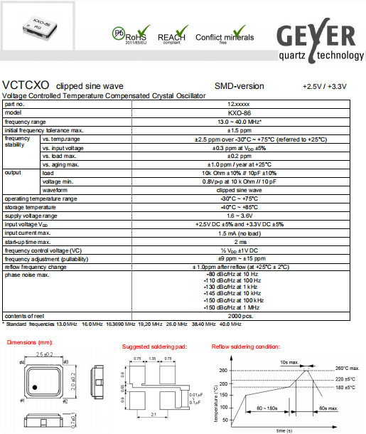 Geyer晶振,KXO-86晶振,VC-TCXO晶振.2520mm體積的石英晶體振蕩器,有源晶振,該產(chǎn)品可驅(qū)動(dòng)2.5V的溫補(bǔ)晶振,壓控晶振,VC-TCXO晶體振蕩器產(chǎn)品,電源電壓的低電耗型,編帶包裝方式,可對應(yīng)自動(dòng)高速貼片機(jī)自動(dòng)焊接,及IR回流焊接(無鉛對應(yīng)),為無鉛產(chǎn)品,超小型,質(zhì)地輕.產(chǎn)品被廣泛應(yīng)用到集成電路,程控交換系統(tǒng),無線發(fā)射基站.