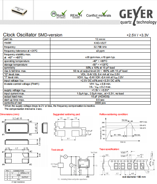 Geyer晶振,KXO-V32T晶振,時鐘晶體振蕩器.有源晶振,是只晶體本身起振需要外部電壓供應,起振后可直接驅(qū)動CMOS 集成電路,產(chǎn)品本身已實現(xiàn)與薄型IC(TSSOP封裝,TVSOP封裝)同樣的1mm厚度,斷開時的消費電流是15 µA以下,編帶包裝方式可對應自動搭載及IR回流焊接(無鉛對應)產(chǎn)品有幾種電壓供選1.8V,2.5V,3V3.3V,5V,以應對不同IC產(chǎn)品需要.