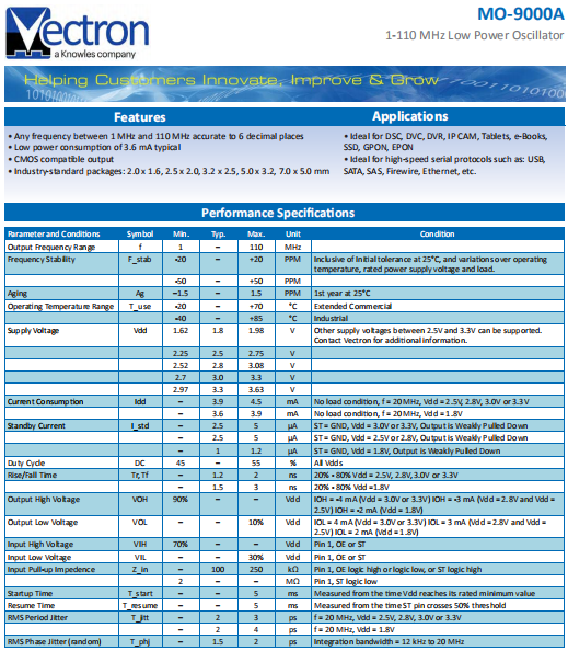VECTRON晶振,MO-9000A晶振,低電壓振蕩器.小體積貼片2520mm晶振,外觀小型,表面貼片型晶體諧振器,因本身體積小等優(yōu)勢,適用于移動(dòng)通信終端的基準(zhǔn)時(shí)鐘等移動(dòng)通信領(lǐng)域.小型,薄型,輕型 (2.5 × 2.0 × 0.75mm typ.) 具備優(yōu)良的耐環(huán)境特性及高耐熱性強(qiáng).滿足無鉛焊接的回流溫度曲線要求.