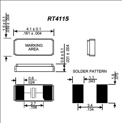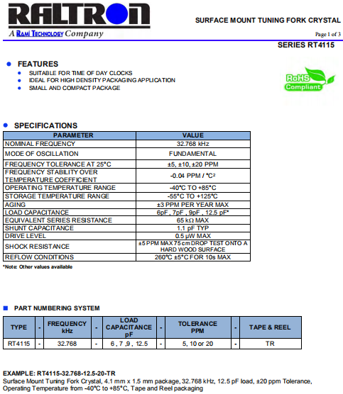 Raltron晶振,RT4115晶振,高品質石英晶體.小體積SMD時鐘晶體諧振器,是貼片音叉晶體,千赫頻率元件,應用于時鐘模塊,智能手機,全球定位系統,因產品本身體積小,SMD編帶型,可應用于高性能自動貼片焊接,被廣泛應用到各種小巧的便攜式消費電子數碼時間產品,環保性能符合ROHS/無鉛標準.