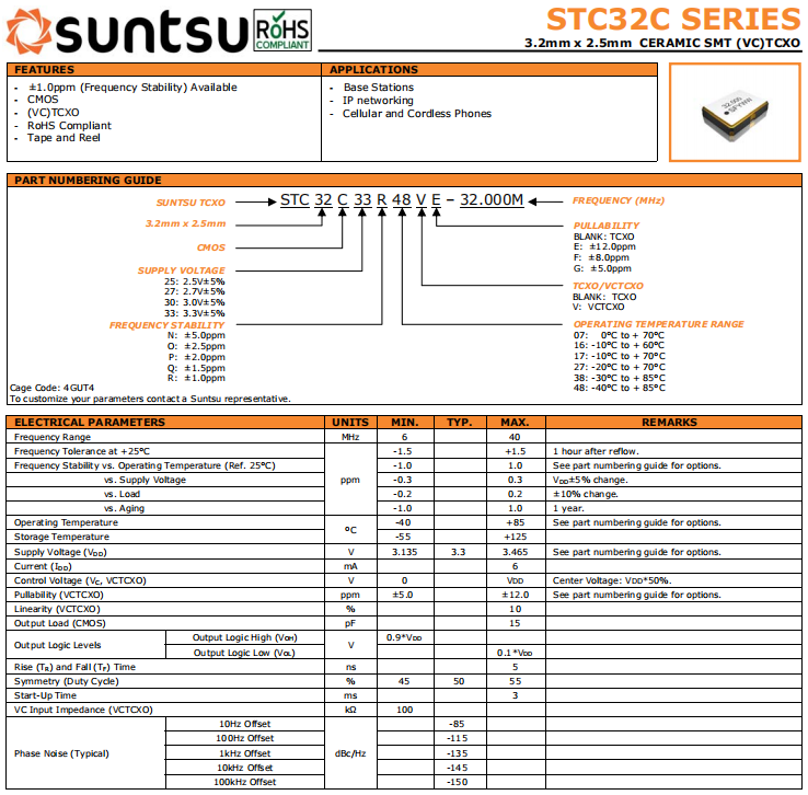 suntsu晶振,STC32C晶振,VC-TCXO振蕩器.3225mm體積非常小的SMDcrystal器件,是民用小型無(wú)線數(shù)碼產(chǎn)品的最佳選擇,小體積的晶振被廣泛應(yīng)用到,手機(jī)藍(lán)牙,GPS定位系統(tǒng),無(wú)線通訊集,高精度和高頻率的穩(wěn)定性能,非常好的減少電磁干擾的影響,是民用無(wú)線數(shù)碼產(chǎn)品最好的選擇,符合RoHS/無(wú)鉛.