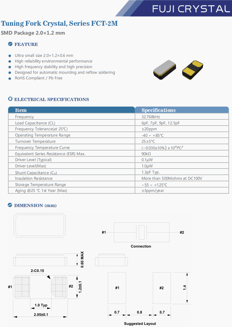 | FCT2M032768C5Y5 | Fuji晶振 | FCT-2M | 32.768 kHz | 12.5pF | -40°C ~ 85°C |