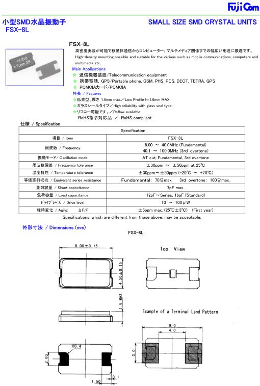 Fujicom富士晶振,FSX-8L兩腳貼片晶振,8045mm無(wú)源晶振,貼片石英晶振最適合用于車載電子領(lǐng)域的小型表面貼片石英晶體振蕩器.也可對(duì)應(yīng)有高可靠性要求的引擎控制用CPU的時(shí)鐘部分簡(jiǎn)稱為時(shí)鐘晶體振蕩器,在極端嚴(yán)酷的環(huán)境條件下也能發(fā)揮穩(wěn)定的起振特性,產(chǎn)品本身具有耐熱,耐振,耐撞擊等優(yōu)良的耐環(huán)境特性,滿足無(wú)鉛焊接的回流溫度曲線要求,符合AEC-Q200標(biāo)準(zhǔn).