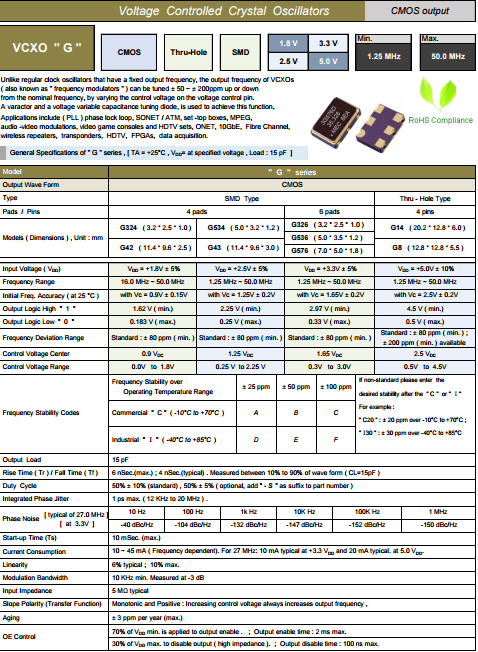 MERCURY晶振,瑪居禮壓控晶振,G576振蕩器.VCXO是指這款晶體產(chǎn)品控制功能只有單壓控也就是電壓控制功能,產(chǎn)品本身頻率精度可以隨著電壓搞定起伏來自動(dòng)調(diào)整頻率,使產(chǎn)品永遠(yuǎn)控制在一定的頻率范圍,壓控晶振(VCXO)壓控石英晶體振蕩器基本解決方案,PECL輸出,輸出頻率60 MHz到200 MHz之間,出色的低相位噪聲和抖動(dòng),三態(tài)功能,應(yīng)用:SDH/ SONET,以太網(wǎng),基站,筆記本晶振應(yīng)用, VCXO,壓控晶體應(yīng)用:調(diào)制解調(diào)器,ADSL網(wǎng)絡(luò)控制器,無線基站,程控交換設(shè)備智能手機(jī),筆記本晶振等.
