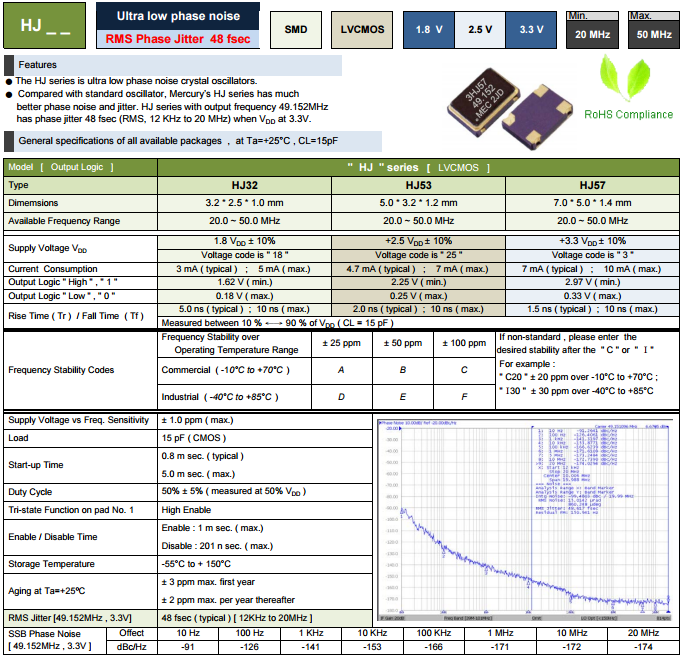 MERCURY晶振,OSC晶振,HJ32晶體振蕩器.有源石英晶振,無論是溫補晶體也好,壓控晶振也罷,產品均采用了,離子刻蝕調頻技術,比目前一般使用的真空蒸鍍方式調頻,主要在產品參數有以下提升:1.微調后調整頻率能控制在±2ppm,一般只能保持在±5ppm;2.產品的激勵功率相關性參數有大幅提升;3.產品的長期老化率可保證在±2ppm之內