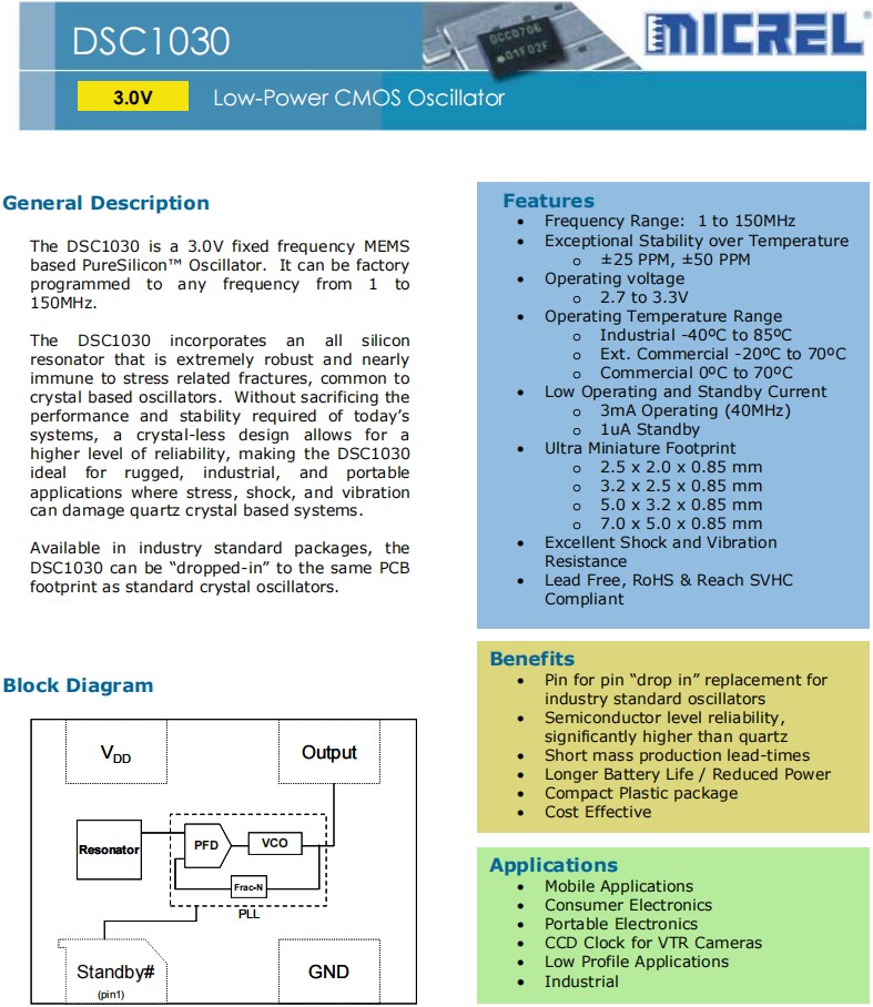 DSC1030是一個3.0V固定頻率MEMS基于純硅™振蕩器。它可以被工廠編程到從1到150MHz的任何頻率。石英晶振DSC1030包含了一個全硅諧振器,它非常堅固,幾乎不受應力相關裂縫的影響,這是晶體振蕩器常見的。在不犧牲當今系統所需的性能和穩定性的情況下,無晶體設計允許更高水平的可靠性,使DSC1030非常適合堅固、工業和便攜式應用,其中應力、沖擊和振動可能會損害基于石英晶體的系統。