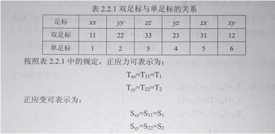 沿x方向應(yīng)力和y方向應(yīng)力的特點(diǎn)是,力的方向與作用面垂直(或力的方向與作用面的法線方向平行)。為了反應(yīng)這兩個(gè)方向在應(yīng)力符號(hào)上要附加兩個(gè)足標(biāo),例如Tx和Ty。應(yīng)力的第一個(gè)足標(biāo)表示力的方向,第二個(gè)足標(biāo)表示作用面的法線方向。同理,應(yīng)變也有兩個(gè)足標(biāo),例如Sx和Sy應(yīng)變的第一個(gè)足標(biāo)表示原長(zhǎng)度的方向,第二個(gè)足標(biāo)表示伸長(zhǎng)量的方向,Tx、Ty又稱(chēng)正應(yīng)力(或伸縮應(yīng)力),Sx、Sy又稱(chēng)為正應(yīng)變(或伸縮應(yīng)變)為了簡(jiǎn)便,通常將足標(biāo)中的(x,y,z)用(1,2,3)表示,而且將雙足標(biāo)簡(jiǎn)化為單足標(biāo),雙足標(biāo)與單足標(biāo)的關(guān)系如表2.2.1所示。