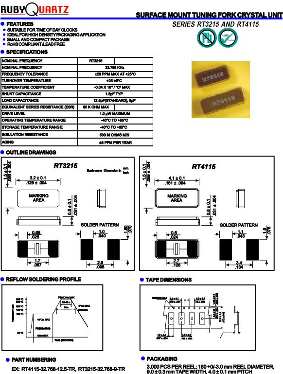 Rubyquartz歐美晶振,RT3215石英晶體,RT3215-32.768K-9-TR諧振器,32.768K時鐘晶體具有小型,薄型,輕型的貼片晶振表面音叉型晶體振蕩器,產品具有優良的耐熱性,耐環境特性,可發揮晶振優良的電氣特性,符合RoHS規定,滿足無鉛焊接的高溫回流溫度曲線要求,金屬外殼的封裝使得產品在封裝時能發揮比陶瓷振蕩器外殼更好的耐沖擊性.