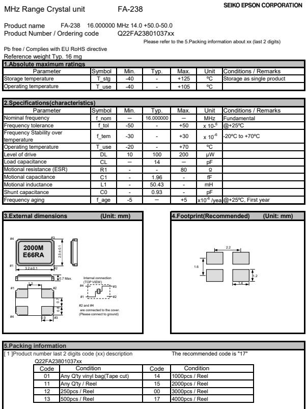 | Q22FA2380102600 | 3.2 x 2.5 x 0.7mm | FA-238 | 00.384000 MHz | 18 pF | +/-50 ppm | +/-30 ppm | -20 to +70 °C |