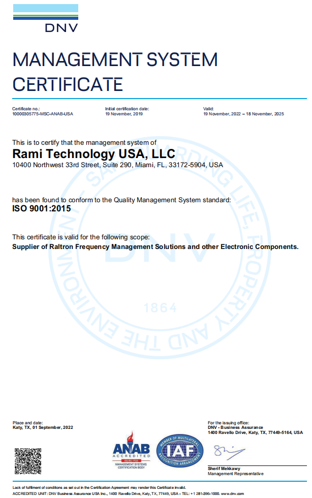 Raltron (RAMI Technology) is committed to delivering products competitively priced and on time that will meet or exceed our customer’s expectations and needs. We will achieve these goals by maintaining high standards of quality in partnership with our customers, employees and suppliers. Our Quality Management System and Objectives will provide the framework to ensure that all requirements are regularly evaluated for continual improvement and assurance of customer satisfaction. The name of Raltron must represent QUALITY to our customers, and nothing less will be accepted as THE standard of performance for Raltron.