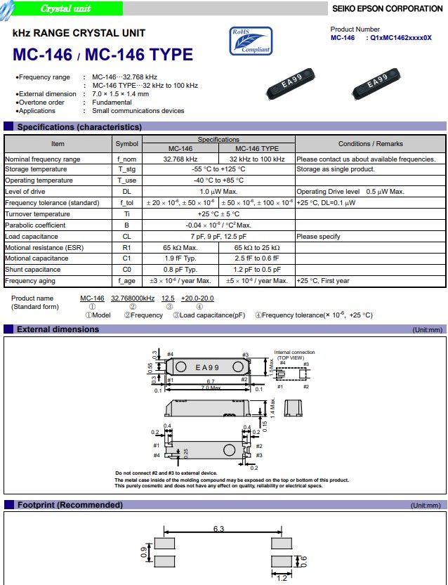4:MC146晶振,尺寸7.0*1.3mm,頻率32.768KHZ。這款米粒大小的晶振曾在2011年風靡整個行業。人人皆知MC146。優點:超小型,薄型,質地輕的表面貼片音叉型晶體諧振器,具備優良的耐熱性,耐環境特性,在辦公自動化,家電領域,移動通信領域。