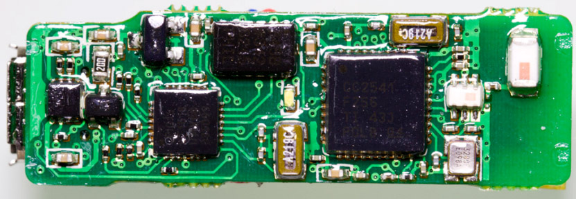 現在就來拆拆手環主機了,由于手環外殼采用熱熔接方式,要拆開手環只能采用暴力方式拆解.揭開外殼,可以看到智能手環主機電路板和零件,從MicroUSB膠塞固定位置上可以看到膠塞頭并沒有完全密封起來,如果游泳時帶著這個手環進入水中可能會導致進水..jpg)