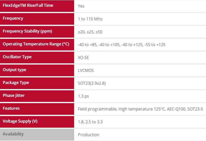 SiTime車用振蕩器相比石英振蕩器可靠性提高30倍,具有以下的特性與優勢: - 滿足AEC-Q100標準一級(-40°C至+125°C)、二級(-40°C至+105°C)與寬泛的溫度要求(-55°C至+125°C)