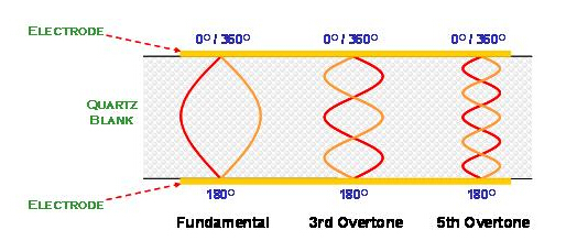 在AT切割角度的石英晶體共振子主要是以厚度剪切振蕩模態存在. 石英晶體在共振時, 除了基本波振蕩之外, 高階的倍頻共振也與基本波振蕩同時存在于石英晶體的電極區域之間. 但是, 由于壓電材料的電極是電氣相位相反的振動環境, 所以, 祇有奇數倍(odd number)的高頻倍頻可以發生, 偶數倍(even number)的倍頻共振在石英晶體共振子是不會存在的.