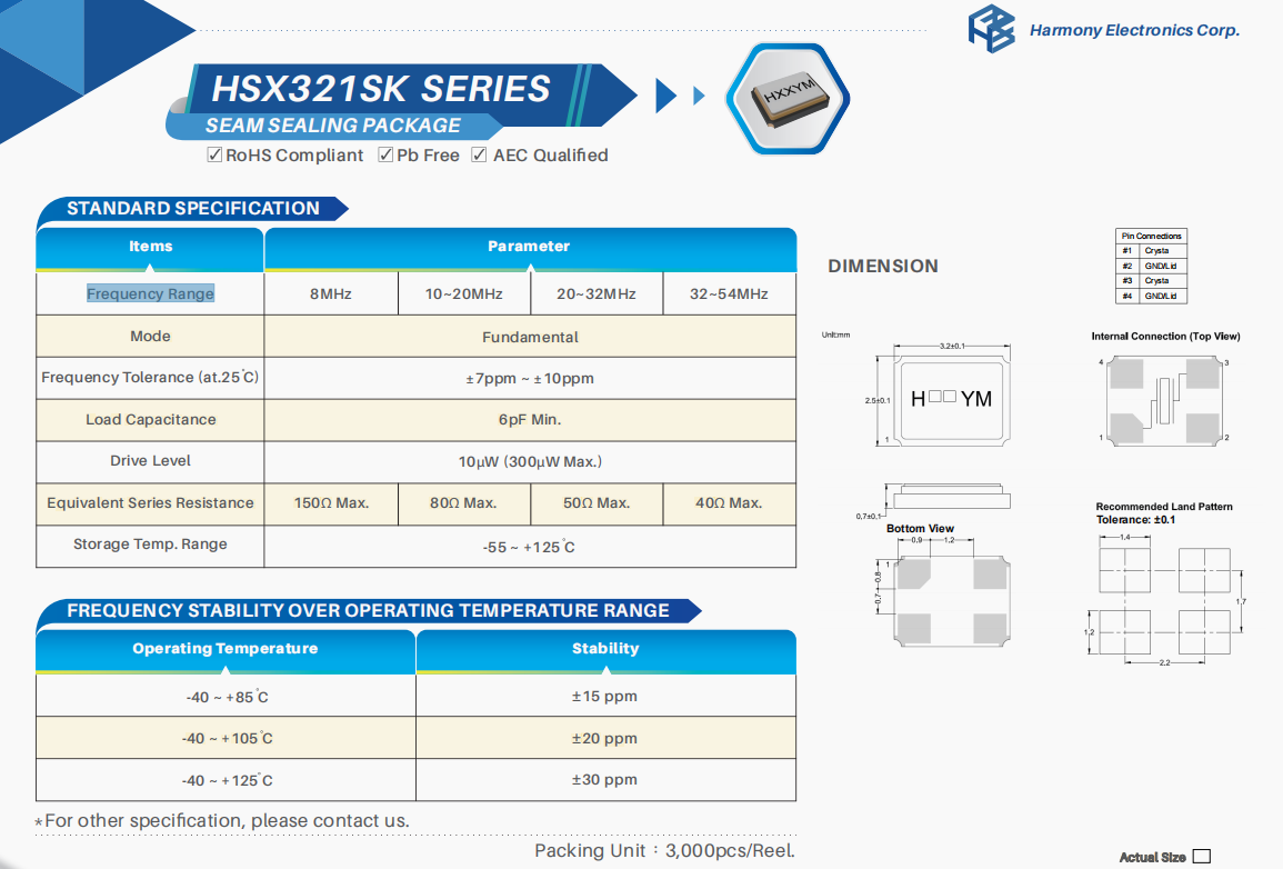 | X3S020000BF1HA‐V | 加高晶振 | HSX321S | 20 MHz | ±30ppm | 15pF |
