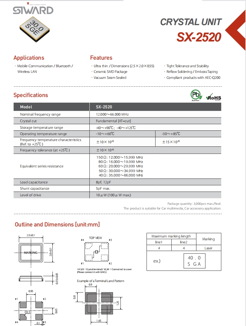 | XTL581150-G47-223 | Siward晶振 | SX-2520 | 40 MHz | ±10ppm | 12pF | -30°C ~ 85°C |